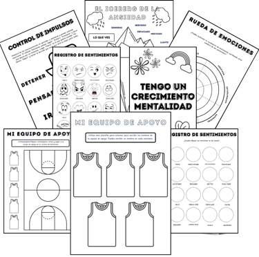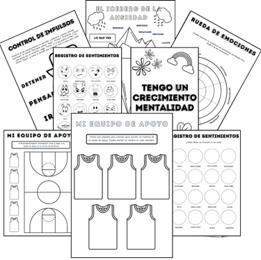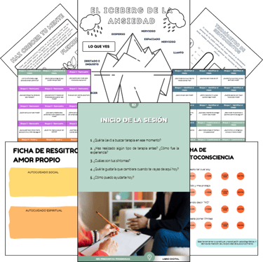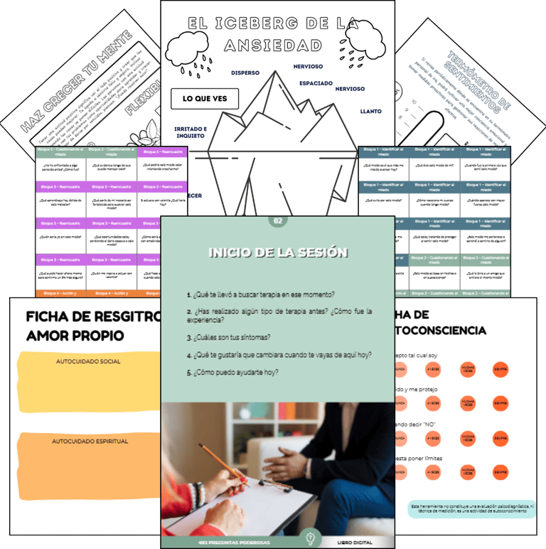 100 recursos terapéuticos listos para imprimir y usar, ideales para trabajar emociones, ansiedad y autoconocimiento en cada sesión.